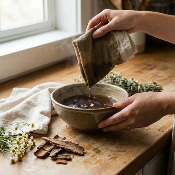 So geht’s: Stelle einen starken Auszug her (z.B. einen Kamillen-Aufguss bei Entzündungen oder einen starken Eichenrinden-Dekokt bei nässenden Hautstellen). Lass ihn auf die gewünschte Temperatur abkühlen – meist lauwarm oder angenehm kühl.