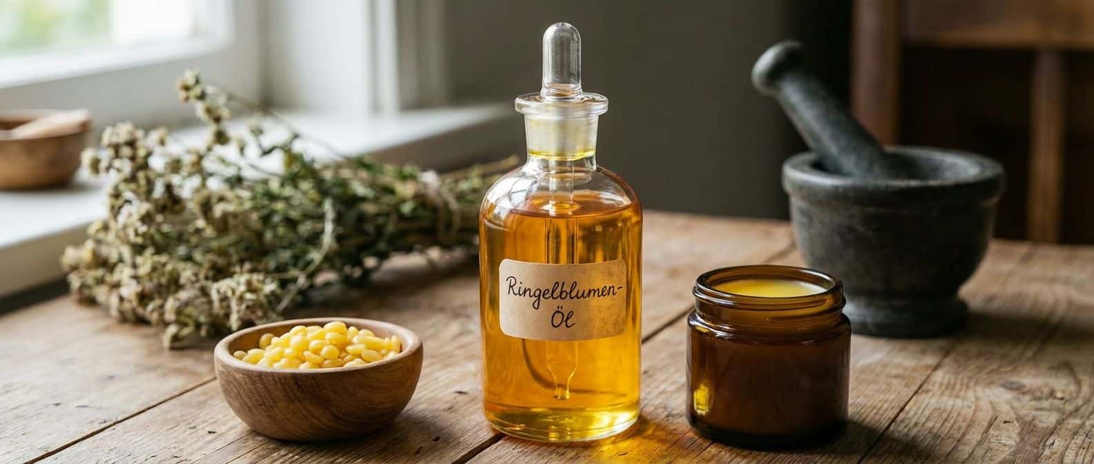 Leinöl ist ein Sonderfall. Die Pflanze wächst hier, manchmal ganz unscheinbar, und ihr Öl ist seit langem bekannt. Leinöl zieht sehr tief, reagiert schnell und ist empfindlich gegenüber Licht und Luft. Für Ölauszüge eignet es sich nur dann, wenn du bewusst damit umgehst und den Ansatz gut im Blick behältst. (Leinöl nutze ich aus eigener Erfahrung auch gern als Holzschutz, weil es tief einzieht und genau dafür sehr gut geeignet ist.)