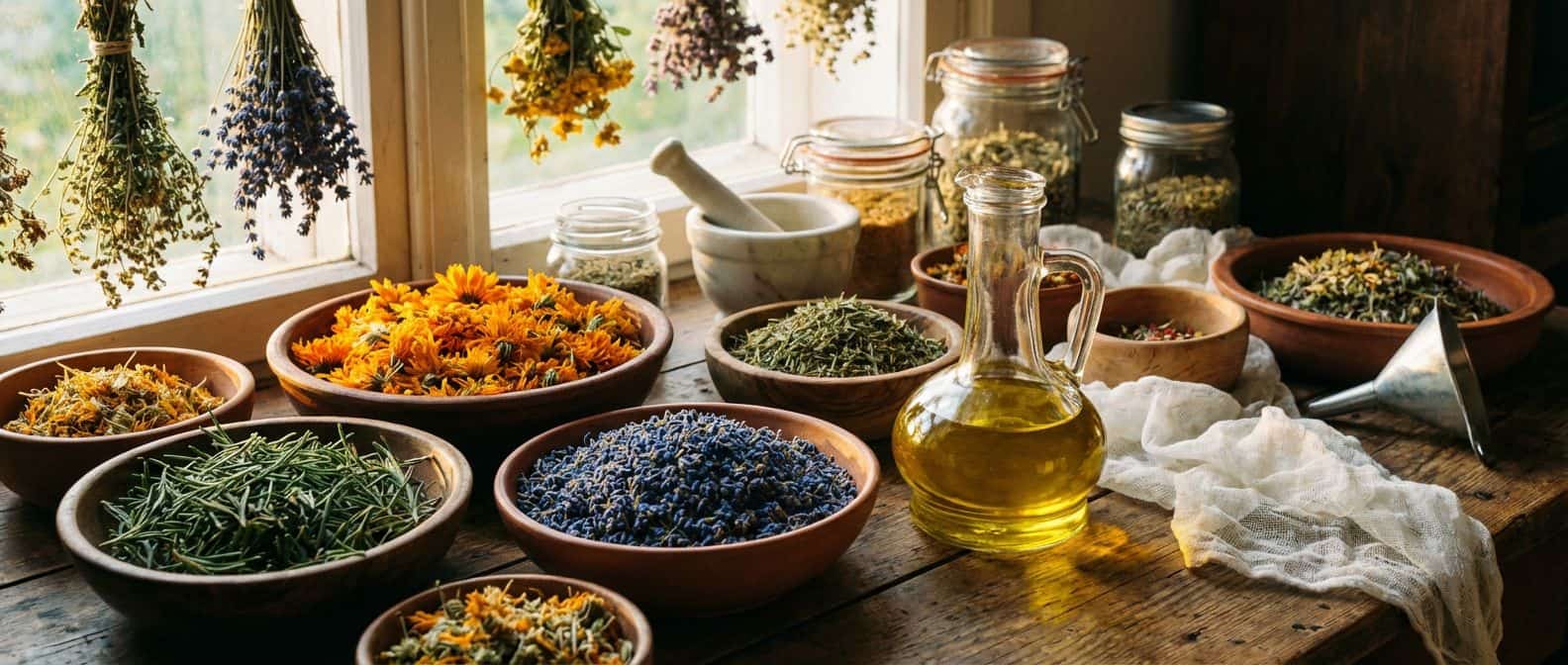 Im Grunde sind es drei Dinge: eine Pflanze, ein geeignetes Öl oder Fett und ein Glas, in dem beides zusammenkommen kann. Das Glas sollte sauber sein und sich gut verschließen lassen. Schraubgläser eignen sich genauso wie Gläser mit Gummiring und Klammer. Du musst dafür nichts neu kaufen. Alte Marmeladengläser, Honig- oder Wurstgläser funktionieren genauso gut. Wer einmal damit anfängt, hebt solche Gläser automatisch auf. Man kann sie sammeln, in einer ruhigen Ecke auskochen und auf Vorrat bereithalten. So ist immer etwas da, wenn man es braucht. Am besten kochst du die Gläser einmal aus, damit nichts den Ansatz verdirbt. Ein einfaches Wasserbad reicht völlig. Mit einer Zange holst du sie heraus, damit du dich nicht verbrennst, und stellst sie zum Abkühlen auf ein sauberes Handtuch. Das ist kein Zaubertrick, sondern eine einfache Gewohnheit. Sauberkeit entscheidet darüber, ob ein Ansatz hält oder schimmelt. Die Pflanze kann frisch oder getrocknet sein, je nachdem, womit du arbeiten möchtest. Sie sollte sauber sein und später vollständig vom Öl bedeckt werden. Das Öl übernimmt die Rolle des Trägers: Es nimmt auf, bewahrt und macht die Pflanze weiter nutzbar. Hilfreich sind außerdem ein Messer und ein Mörser. Beides brauchst du immer wieder, unabhängig davon, mit welcher Pflanze du arbeitest. Mehr Ausstattung ist für den Anfang nicht nötig. Ein ruhiger Platz für den Ansatz und etwas Geduld gehören ebenfalls dazu.