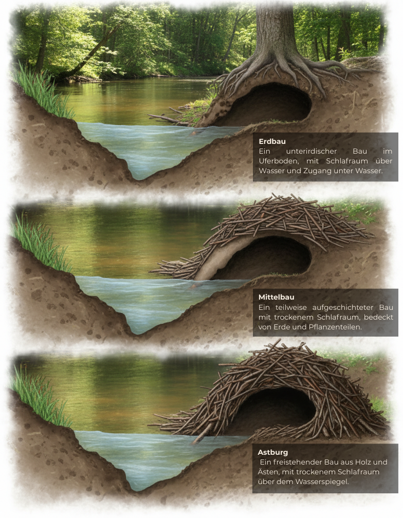 Am Ufer gräbt der Biber einen Erdbau. Der Schlafraum liegt im festen Uferboden, überdeckt von Erde und Wurzeln. Von außen ist er kaum sichtbar. Stabilität entsteht hier durch das, was bereits da ist.