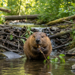 Ein Biber baut in einem flachen Bach einen Damm aus Ästen und Zweigen. Das gestaute Wasser fließt langsamer und bildet ruhige Zonen, die dem Tier Schutz und Lebensraum bieten.