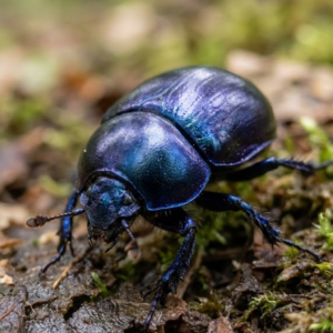 Ein Biber sitzt am moosbewachsenen Ufer eines ruhigen Bachlaufs im herbstlichen Wald und blickt aufmerksam in die Umgebung.